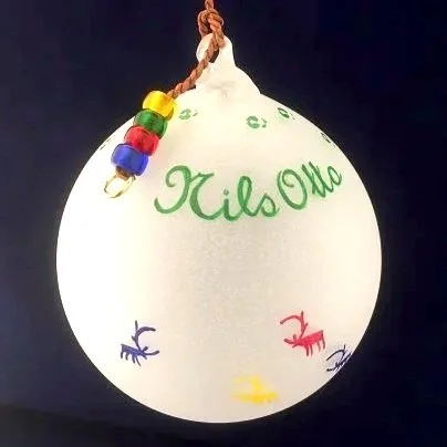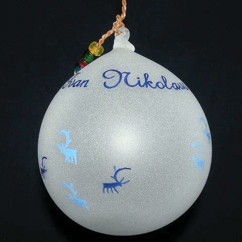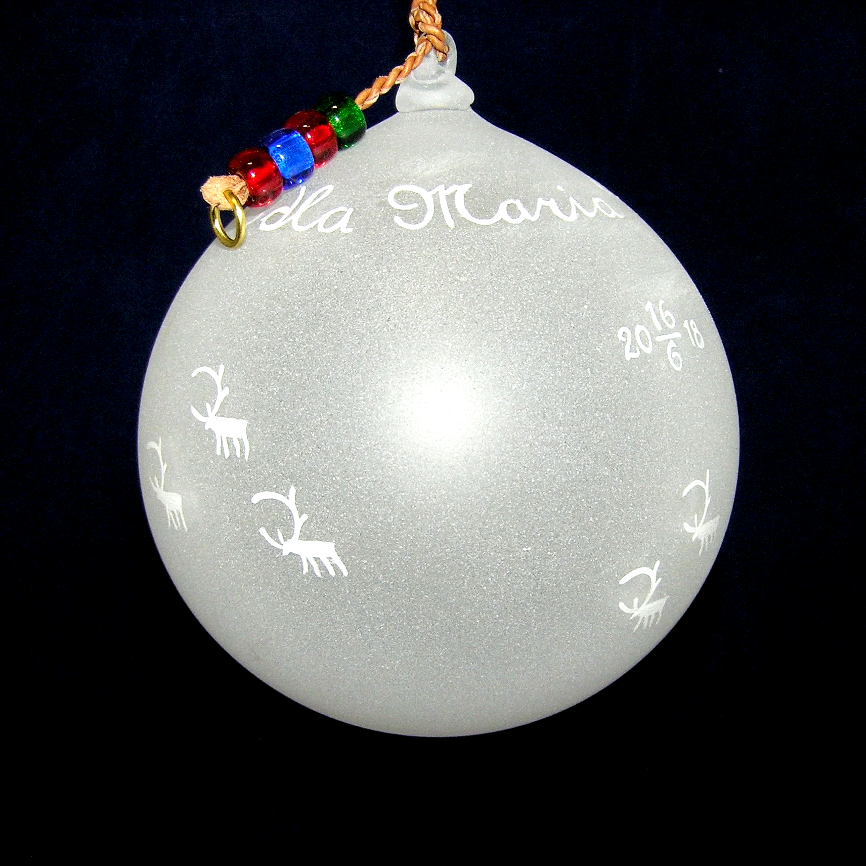 Munblåst kula ca kula ca 10 cm ø, med tvinnad snodd av hem garvat renskinn, dekorerad med pärlor och mässingring. Frostad botten med motiv och text i vitt
