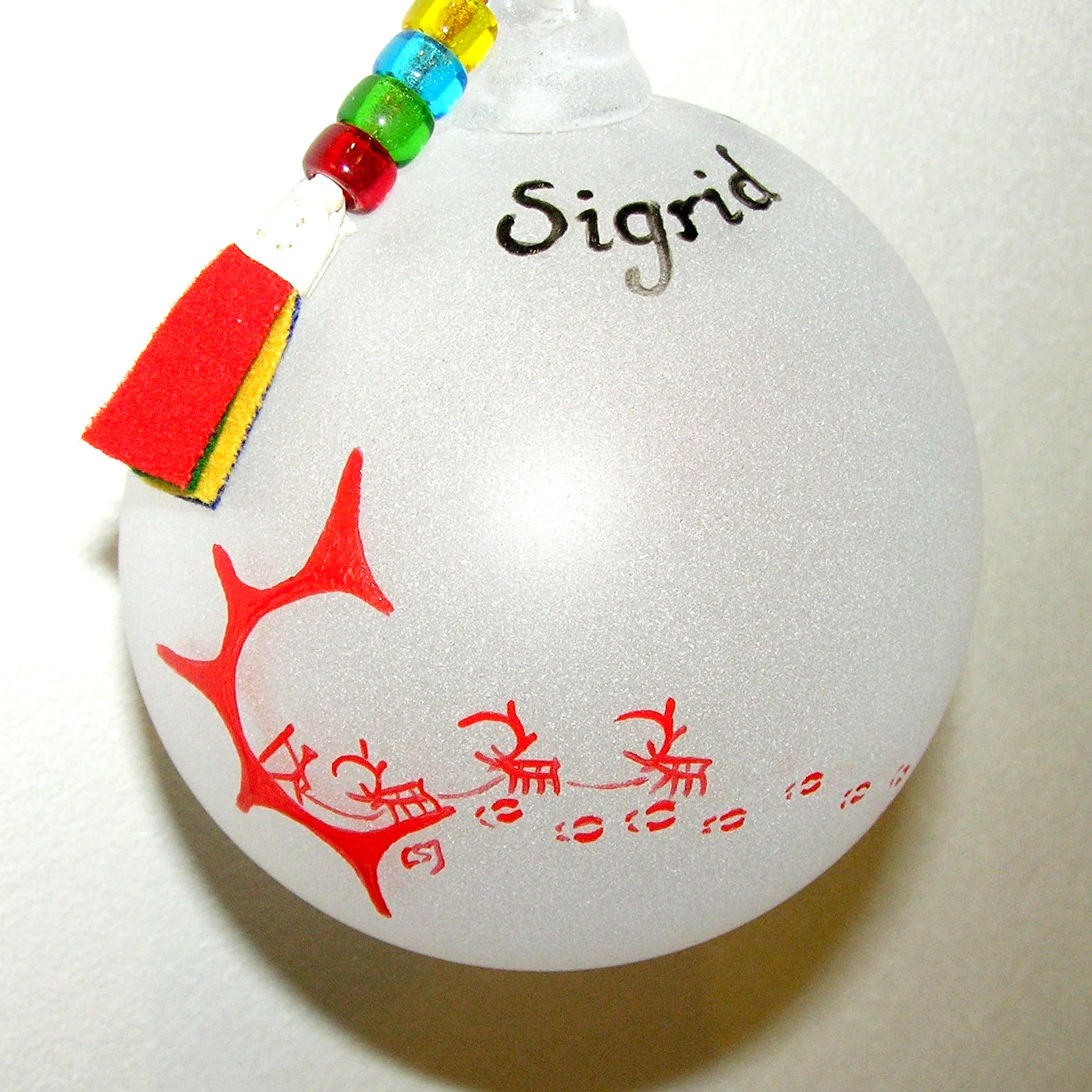 Munblåst kula ca 10 cm ø, med tvinnad snodd av hem garvat renskinn, dekorerad med pärlor och klädestofs. Frostad botten med motiv och text i rött och svart.