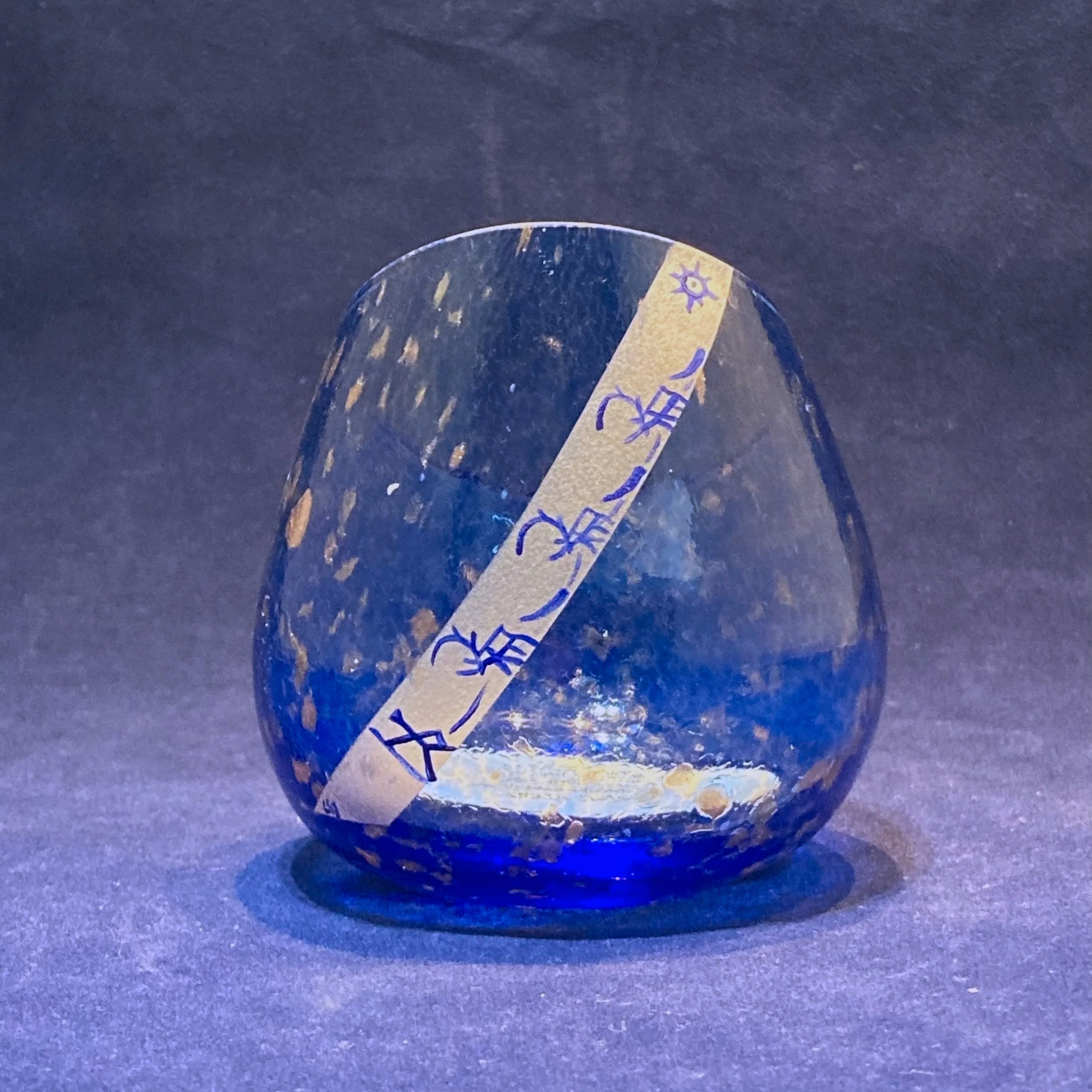 En munblåst ljuslykta i blått med guldstänk. Varje lykta blir unik. Höjd varierar