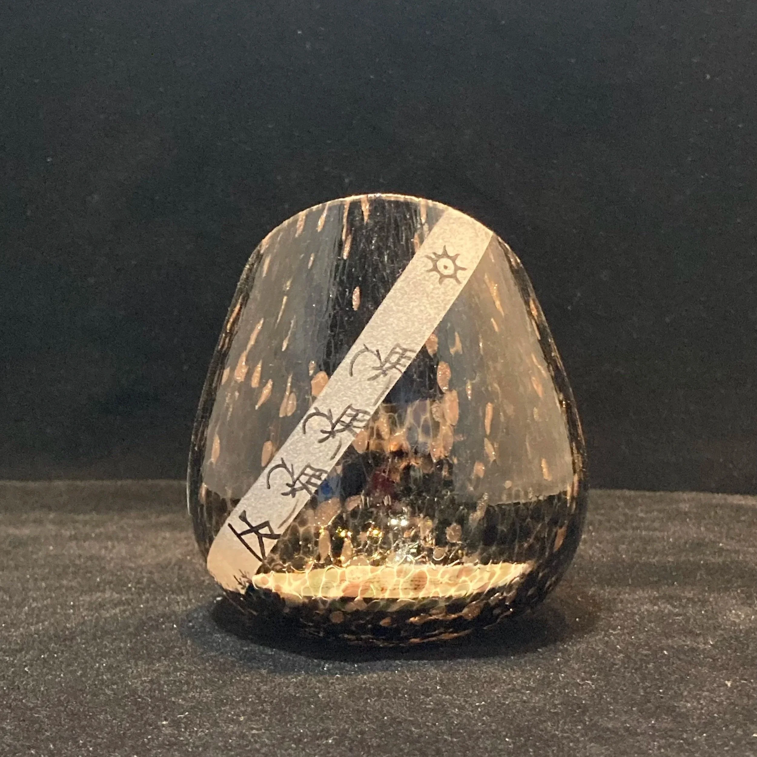 En munblåst ljuslykta i svart med guldstänk. Varje lykta blir unik. Höjd varierar